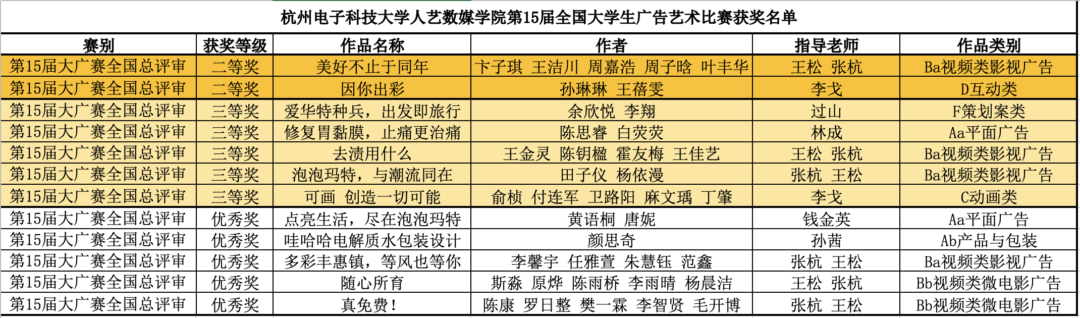 近日,第十五届大学生广告艺术大赛全国奖项结果揭晓。此次大赛中,我校共获得12项全国奖,包括两项全国二等奖、五项全国三等奖和五项全国优秀奖,在浙江省高校中名列前茅,也是历年参赛获得的最佳成绩。